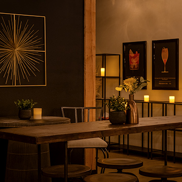 Right sized for 100 guests or less, furnished with high top lounge style tables and stools coupled with lower intimate cocktail style tables of 2, 4 or beautiful harvest tables seating upwards of 10, the space can be configured to all situations. Need help designing a layout, we can provide you with some layout options depending on the nature of your event, and have it setup and ready for you when you arrive.